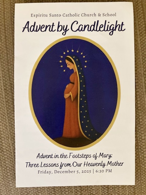 Advent by Candlelight is a beautiful ritual that I was privileged to be part of Friday night. It took place at Espiritu Santo parish in Safety Harbor, Florida. After each giant candle on an Advent wreath was lighted, a high school student read a guided meditation. Advent hymns were interspersed, sung by a small choir and us. Women sang a duet for “I Wonder As I Wander.” To conclude, I spoke on living Advent in the footsteps of Mary. Afterwards, we all moved to a large hall for appetizers, desserts, and fellowship.