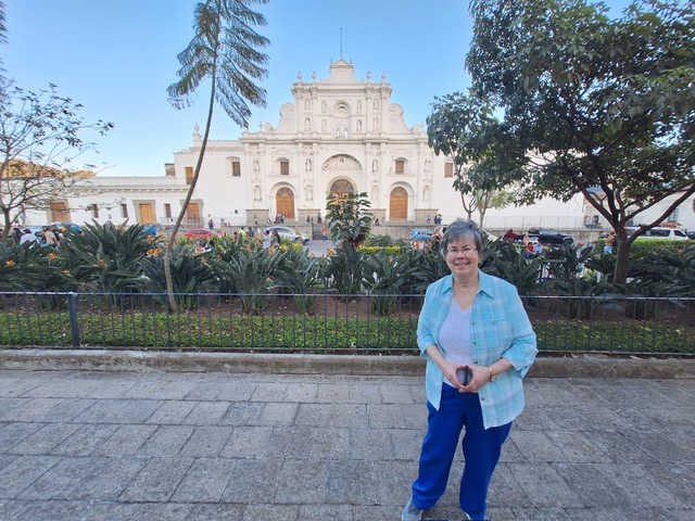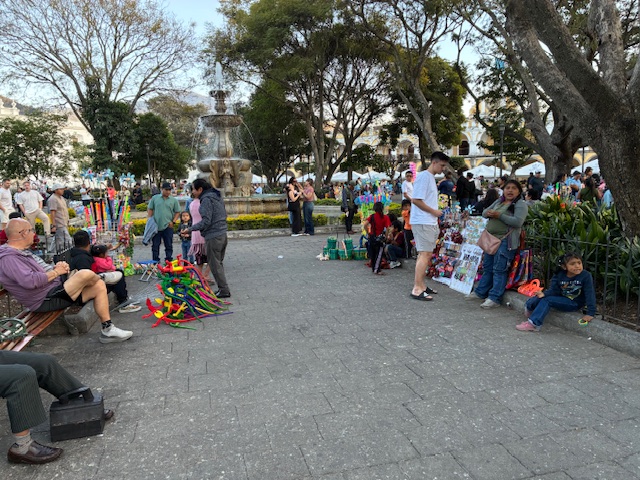 At the top of another hill, a large cross overlooks the city of Antigua. Fortunately, we took an Uber most of the way up and down the cobblestone path. A statue of a quetzal, a colorful bird with long tail feathers, is a prop for photos. This bird is prominent in mythology and associate with the Aztec deity Quetzalcoati. It is Guatemala’s national bird and the name of its currency. As we left the site, soldiers lined the stairs, presumably to discourage robbers.