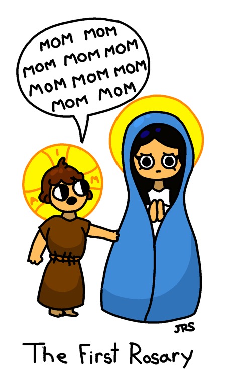 John Smile’s cartoon here is title “the first Rosary.” In the Rosary we call on our blessed Mother no less than 53 times as we pray its Hail Marys.