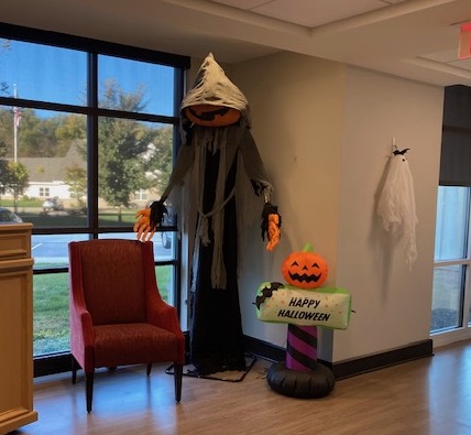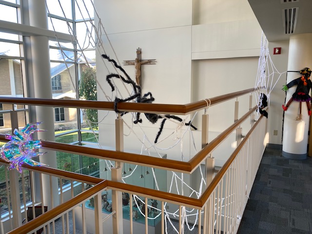 Halloween’s not just for kids. Here in our province center, we celebrate it big time. Each hall in our Health Care is decorated by different departments. It’s a contest. Big leaves hang from the ceiling all down a hall. The giant spider webs were awesome.